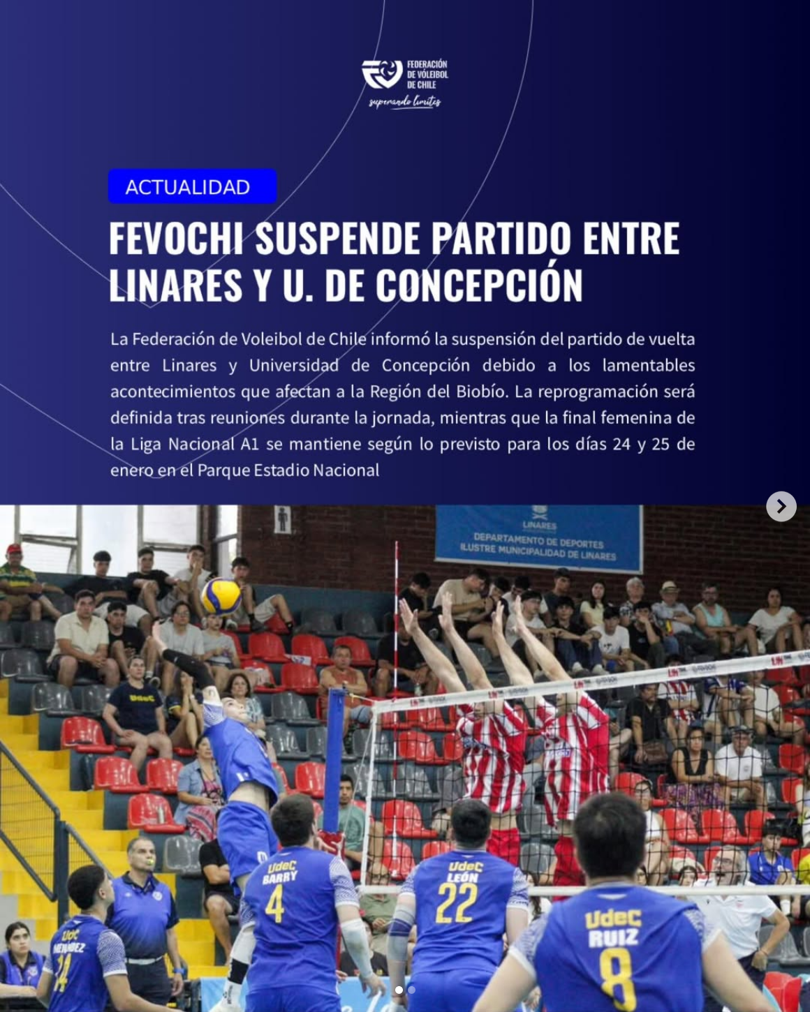 Mientras tanto en la jornada sabatina, Linares aprovechó su localía para vencer 3:0 a la Universidad de Concepción (25-21 / 25-22 / 25-12); sin embargo, el duelo de vuelta entre UdeC y Linares debió ser suspendido debido a los lamentables acontecimientos que afectan al sur del país, particularmente a la Región del Biobío por lo que ese encuentro se estaría realizando este miércoles 21 a las 19:00 en Concepción, y en caso que no pueda ser realizado por estas razones de emergencia, se disputará el día jueves 22 igual 7pm pero en la capital Santiago.